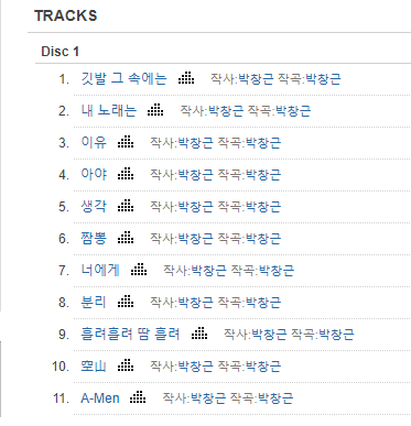 앨범에 수록된 전곡을 작사. 작곡한 실력을 갖춘 싱어송라이터입니다. 박창근의 정규앨범에 수록된 곡들을 감상해 보시겠습니다. 아래에서 확인하실 수 있습니다.